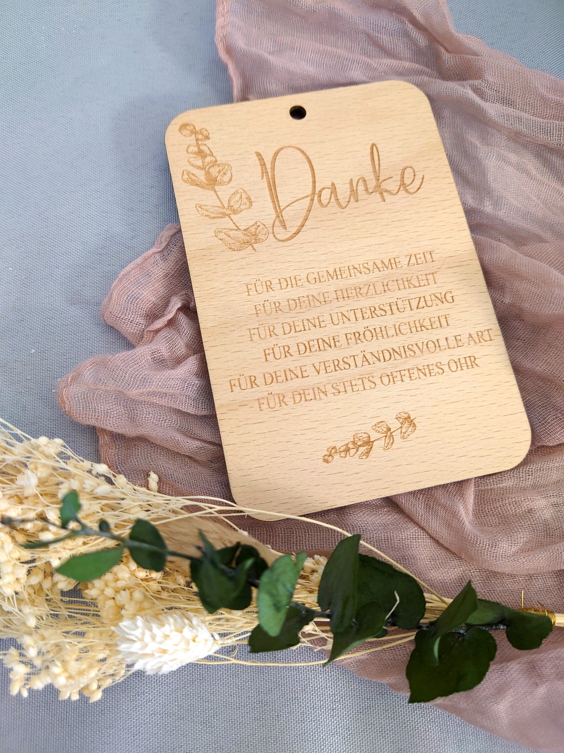 Das schöne Holzschild ist die perfekte Art, um auf besondere und persönliche Weise "Danke " zu sagen. Gefertigt aus nachhaltigem Buchenholz,verziert durch seine schlichte Eleganz und die detailreiche Lasergravur.