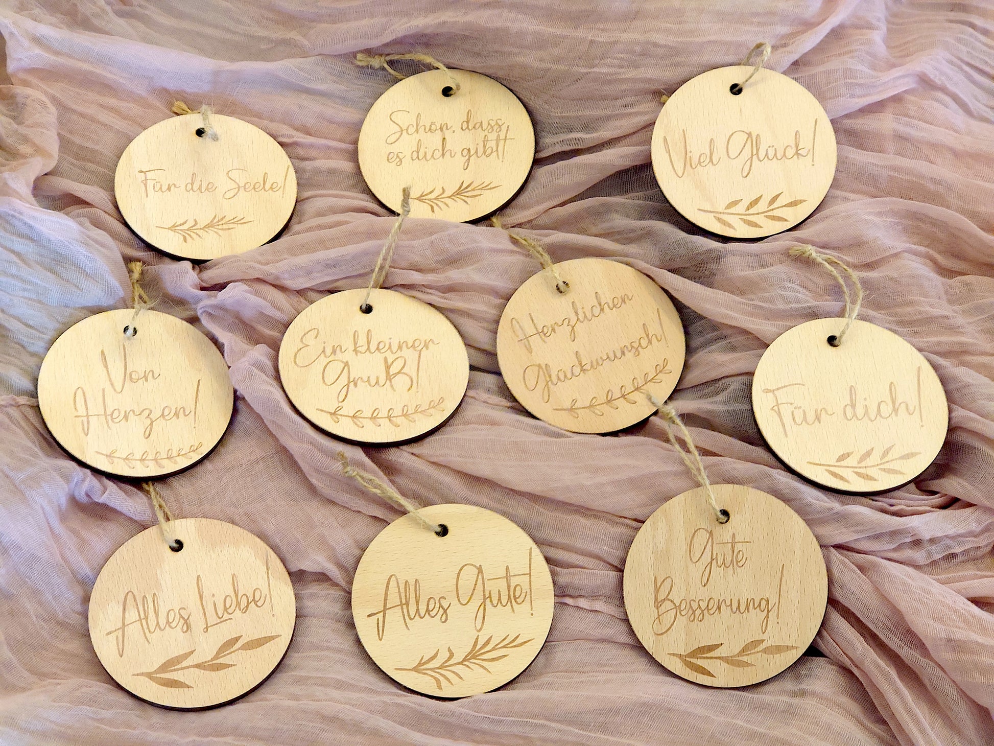 Verleihe deinem Geschenk,ob Blumensträußen oder Dekorationen eine persönliche und liebevolle Note mit unseren wunderschön gravierten Holz Glückwunsch- Anhänger. Perfekt, um deine Wertschätzung und besten Wünschen auf stilvolle Weise auszudrücken.