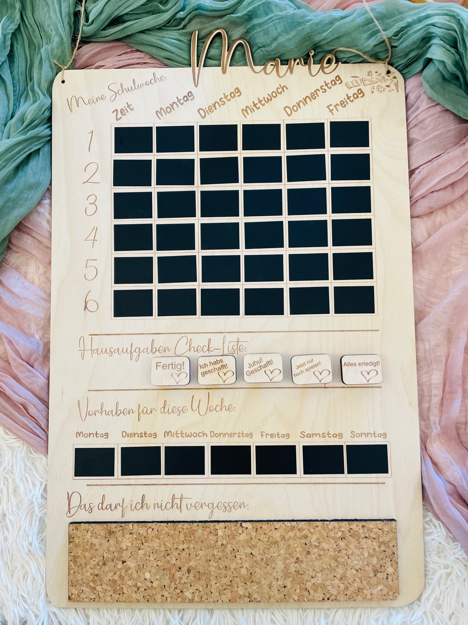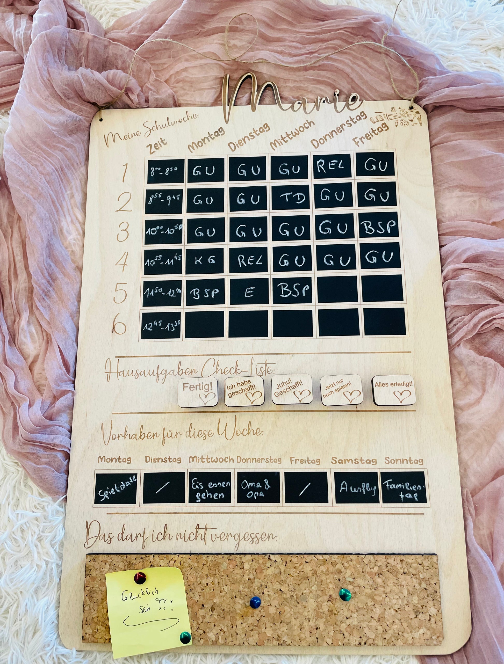 Dieser liebevoll gestaltete Wochenplaner ist die perfekte Lösung, um den Alltag für die ganze Familie übersichtlicher zu gestalten. Gefertigt aus nachhaltigem Buchenholz, bietet er eine ansprechende und nachhaltige Alternative zum Papierkalender. Die schwarzen Felder können mit Kreide beschriftet werden.
